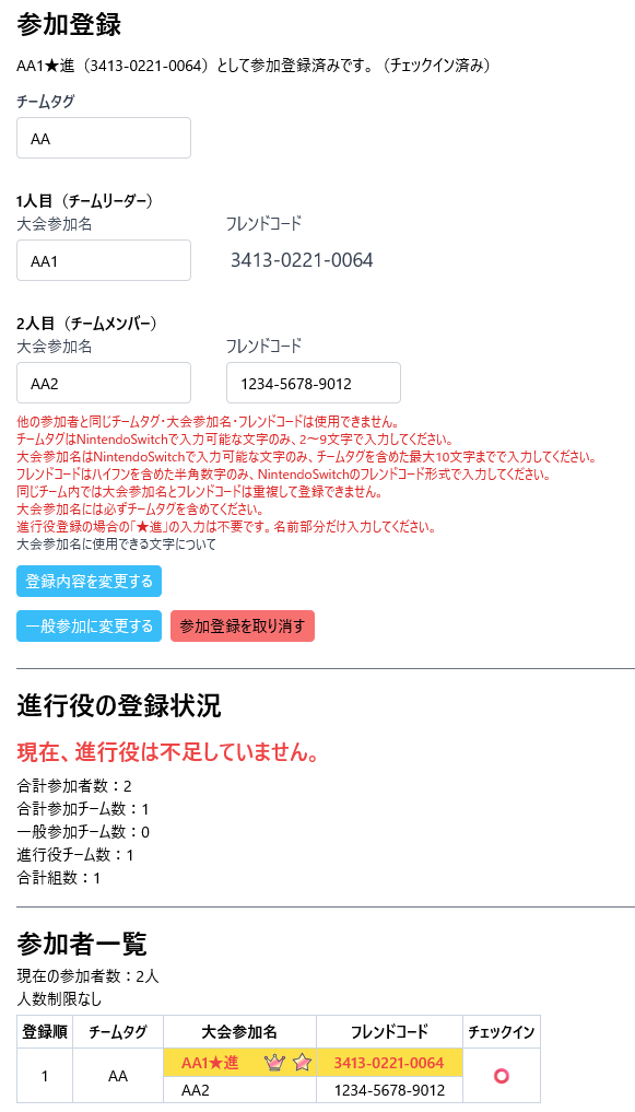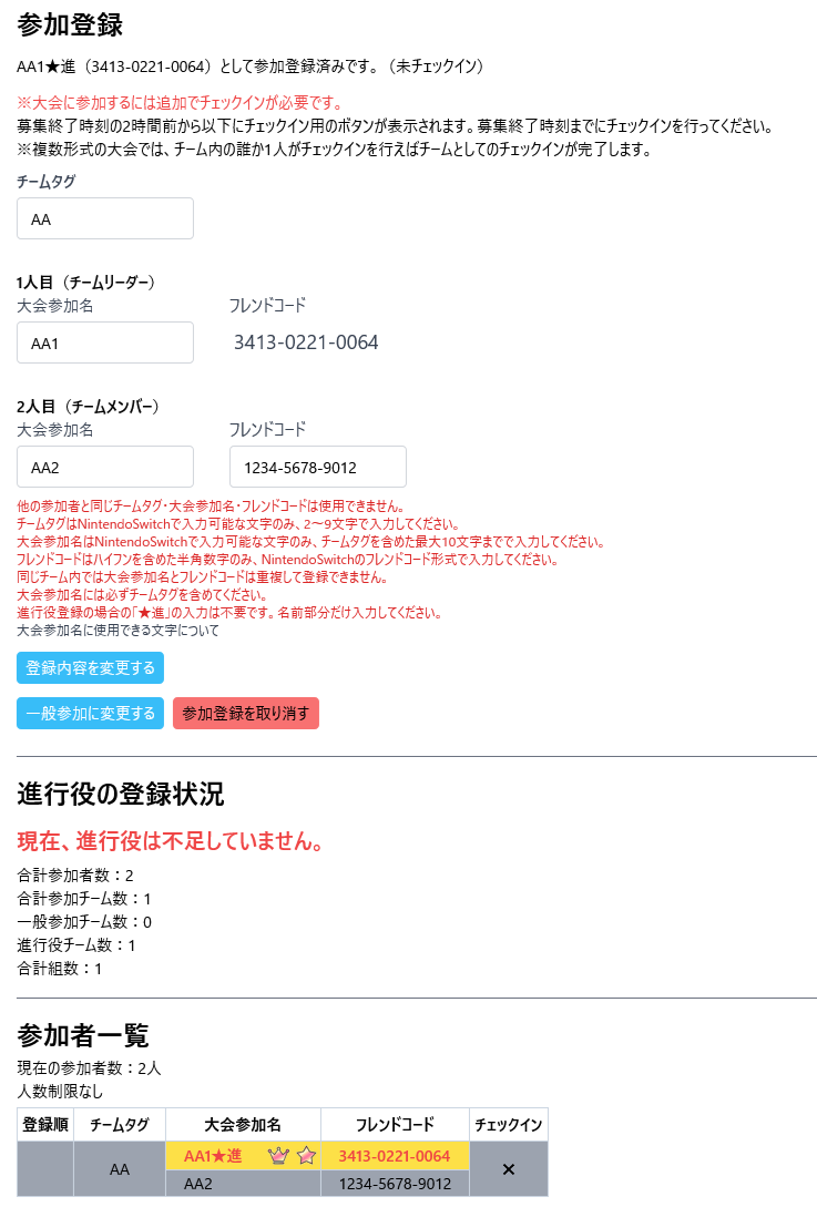 この状態で「本登録」となり、組分け用参加者リストに表示されるようになります。