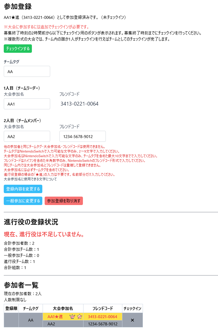 チェックイン機能が有効な大会応募フォームで参加登録を行うと、以下のような表示となります。